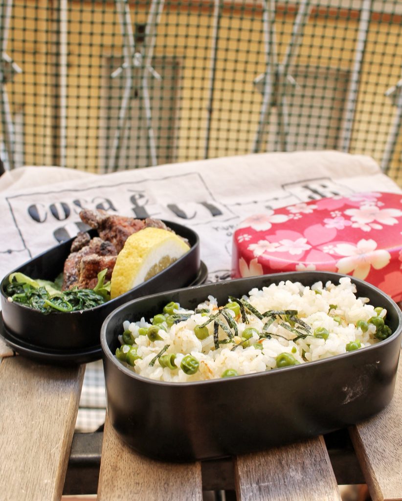 E così, oggi il mio pranzo japan style prevede un delizioso mame gohan (riso e piselli), accompagnato dal tori no karaage, il pollo fritto giapponese, e spinaci al sesamo.